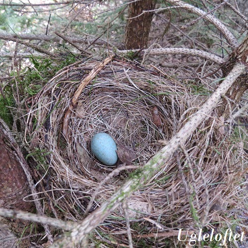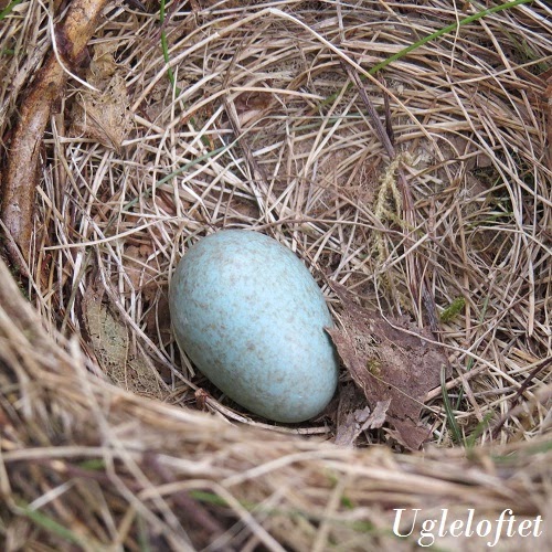 Et lyseblått egg med brune prikker! Utrolig vakkert - men jeg klarte å motstå fristelsen til å ta på det. Jeg tok et par kjappe bilder og skyntet meg unna slik at svarttrostmammaen fikk fortsette å ruge i fred.