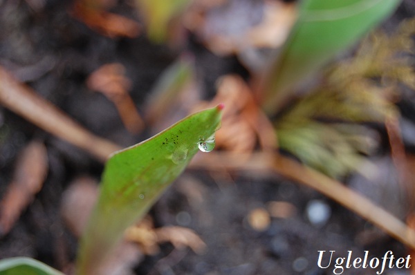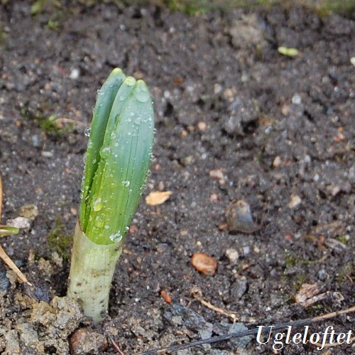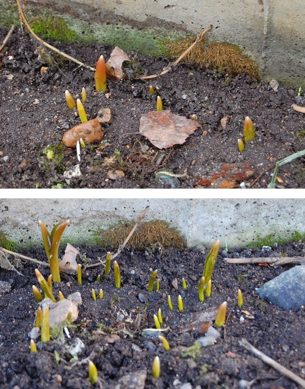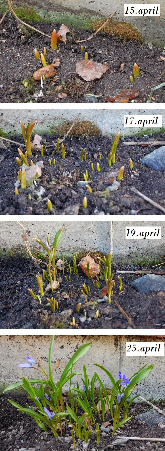 | Det jeg lurer på om kan være snøklokker, impulsplantet tett inntil husveggen der snøen tiner aller først. Samme sted fotografert 15.april (øverst) og 17 april (nederst) |