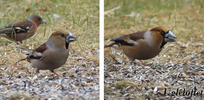 | Hannen hos kjernebiterne har mer rødt i brunfargen på hodet enn det hunnen har. (Bokfink i bakgrunnen) |