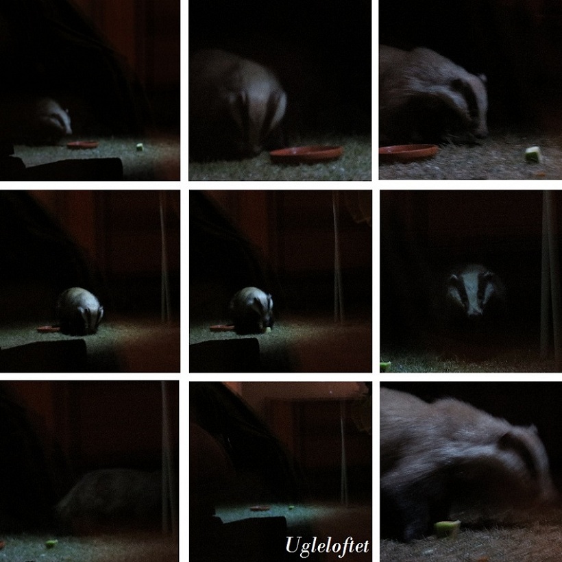 Nå er det ingen dyr som kan snike seg rundt i hagen vår usett på kvelden. Skal herr grevling ha mat må han finne seg i å posere på noen bilder samtidig. Kvaliteten blir best når det er helt mørkt i stua og når herr grevling står helt i ro.