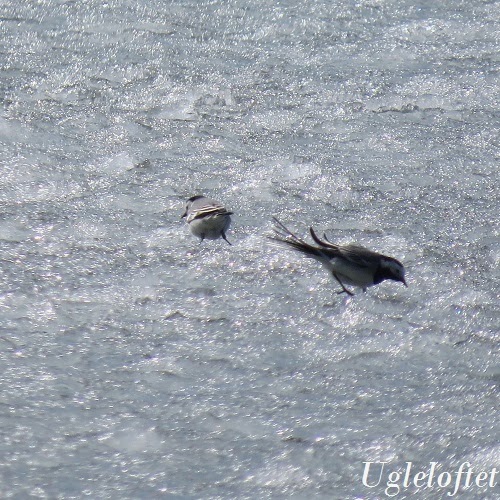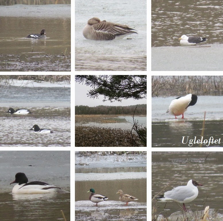 Jeg fant en ny sti i skogen i går ettermiddag, en ny sti som viste seg å gå til en for meg ukjent del av vannet "vårt". Her var det våtmark og allerede yrende fugleliv, selv om isen såvidt har åpnet seg noen steder. Jeg må innrømme at jeg er pinlig utrent på disse artene, og bortsett fra stokkand, grågås og hettemåke er de fleste bare en salig blanding av sorte og hvite fjær. Jeg har allerede slått fast at målet for denne sesongen blir å lære meg så mange vadere, ender, gjess og måker som mulig.