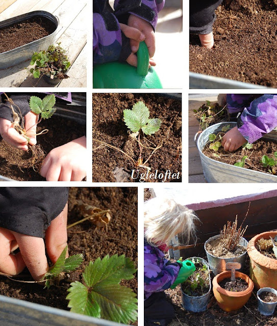 I helgen fjernet jeg mer plen rundt pallekarmene, og i kanten var det mange små avleggere av markjordbær. De fikk jeg meg ikke til å kaste, og nå har de fått nytt liv i minstemors egen lille hage. Små markjordbærplanter egner seg fint som det første hageprosjektet til barna. De tåler røff behandling både under planting og etterpå. De er tilgjengelige og har allerede spiret, de er gratis, trives i potter, vokser fort, gir mange avleggere og resultatet kan spises. I mangel av markjordbær kan vanlige jordbærplanter eller markjordbær også brukes.