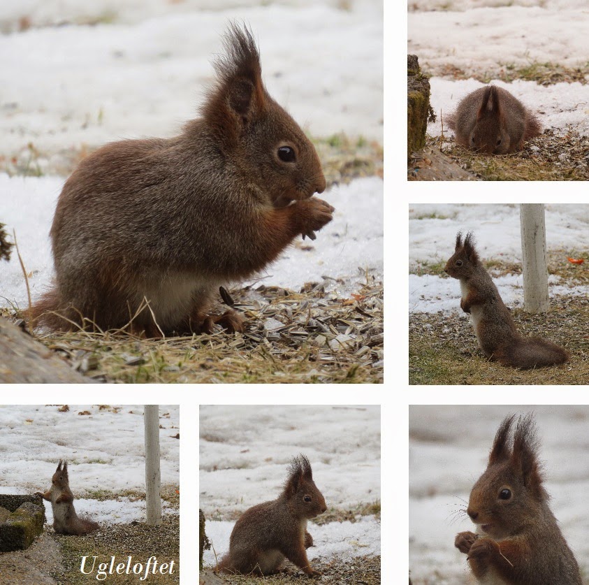 Etter at vi begynte arbeidet med ny terrasse og flyttet foringsplassen noen meter har vi ikke sett ekornet "vårt". Disse bildene er tatt rett før den siste snøen forsvant. Som vanlig tok det seg god tid med formiddagsmaten, mens det passet godt på at ingen farer nærmet seg.